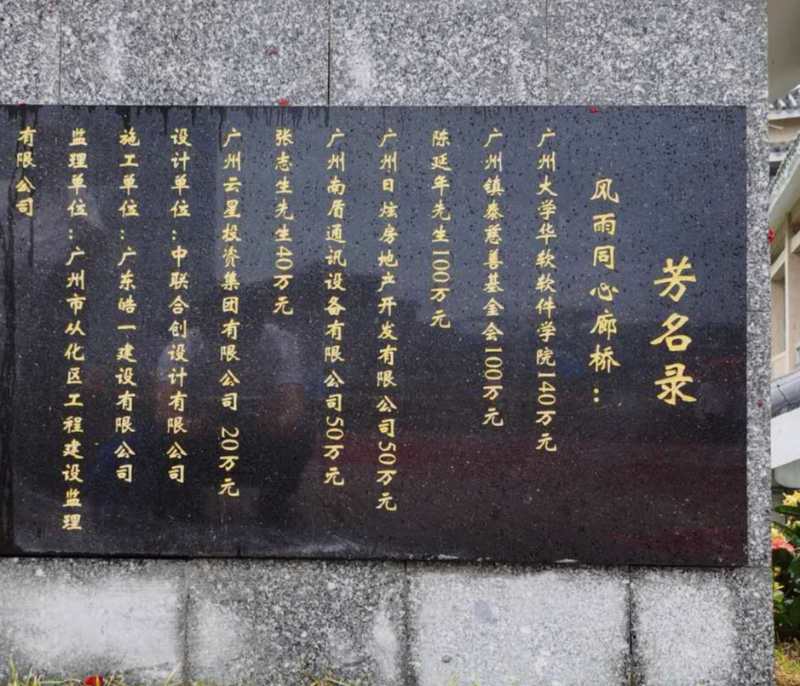 呂田鎮(zhèn)風(fēng)雨同心廊橋及濱河廣場(chǎng)是由從化政協(xié)牽頭組織,KEYDAK(金盾)、珠光控股集團(tuán)有限公司、廣州大學(xué)華軟軟件學(xué)院、廣州鎮(zhèn)泰慈善基金會(huì)等共同捐資805萬元建設(shè)而成。